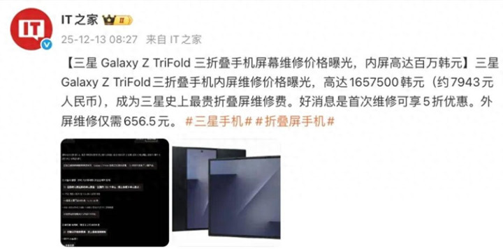 折叠屏圈爆争议!三星首款三折叠Galaxy Z TriFold国行限量预售:16+512GB 19999元、1TB 21999元,赠凯夫拉壳等配件。但内屏维修费7943元(首修5折)的消息,让网友直呼“修不起”。对比华为Mate XTs,这款双铰链10英寸旗舰值不值?实测见分晓!
